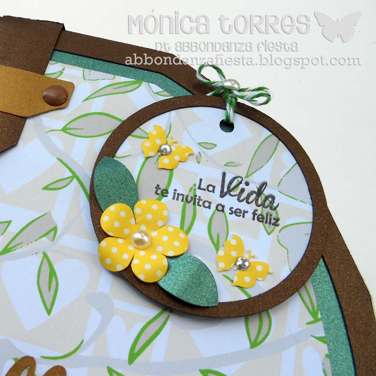 Aquí un acercamiento al tag que cuelga del asa, decorado con twine, un lindo sellito de Latina Crafter, de la colección "Vive Ama Sueña" diseñada por esta servidora y las bellas medias perlas que hacen centro a las flores, tanto los brads como las medias perlas también son productos de Abbondanza Fiesta.